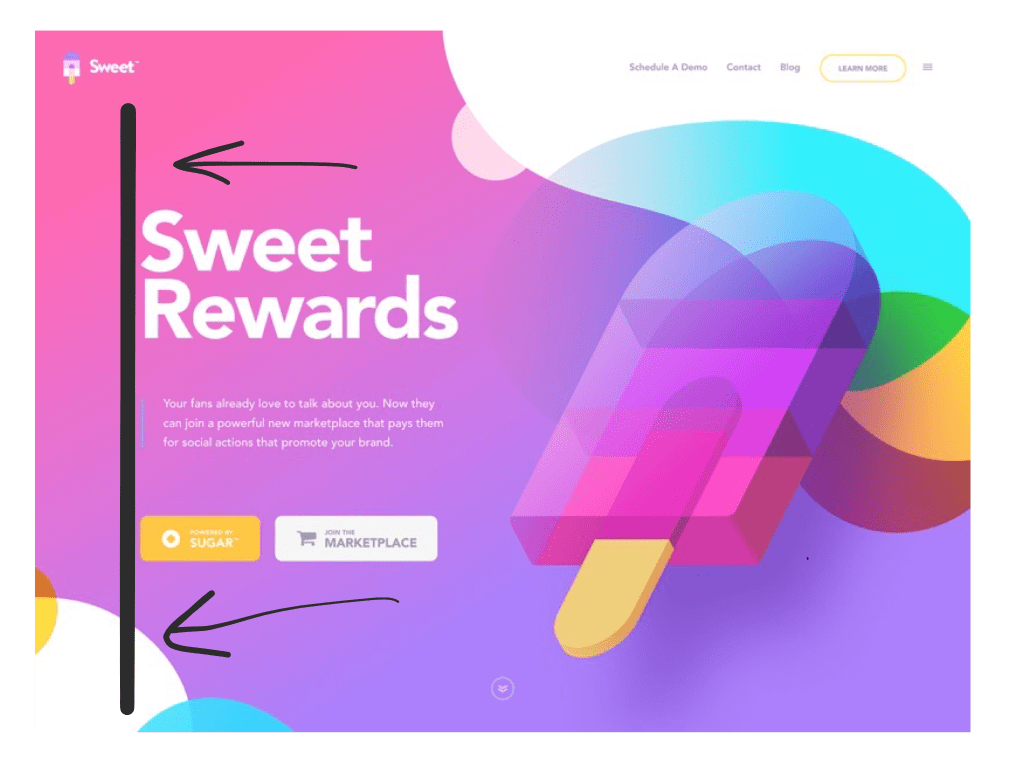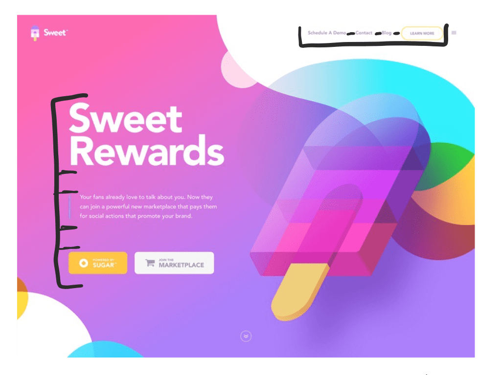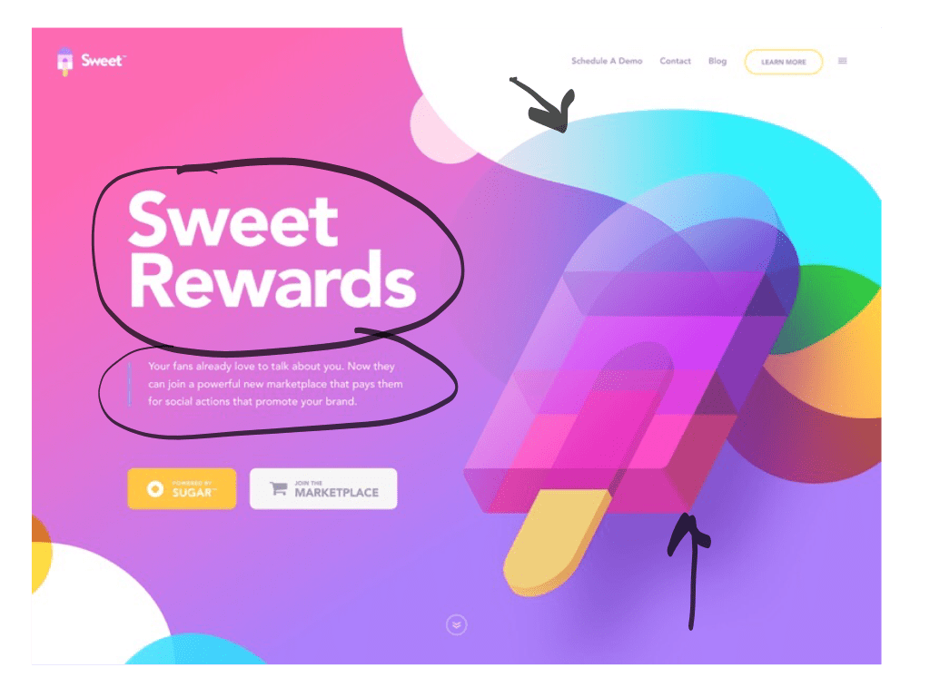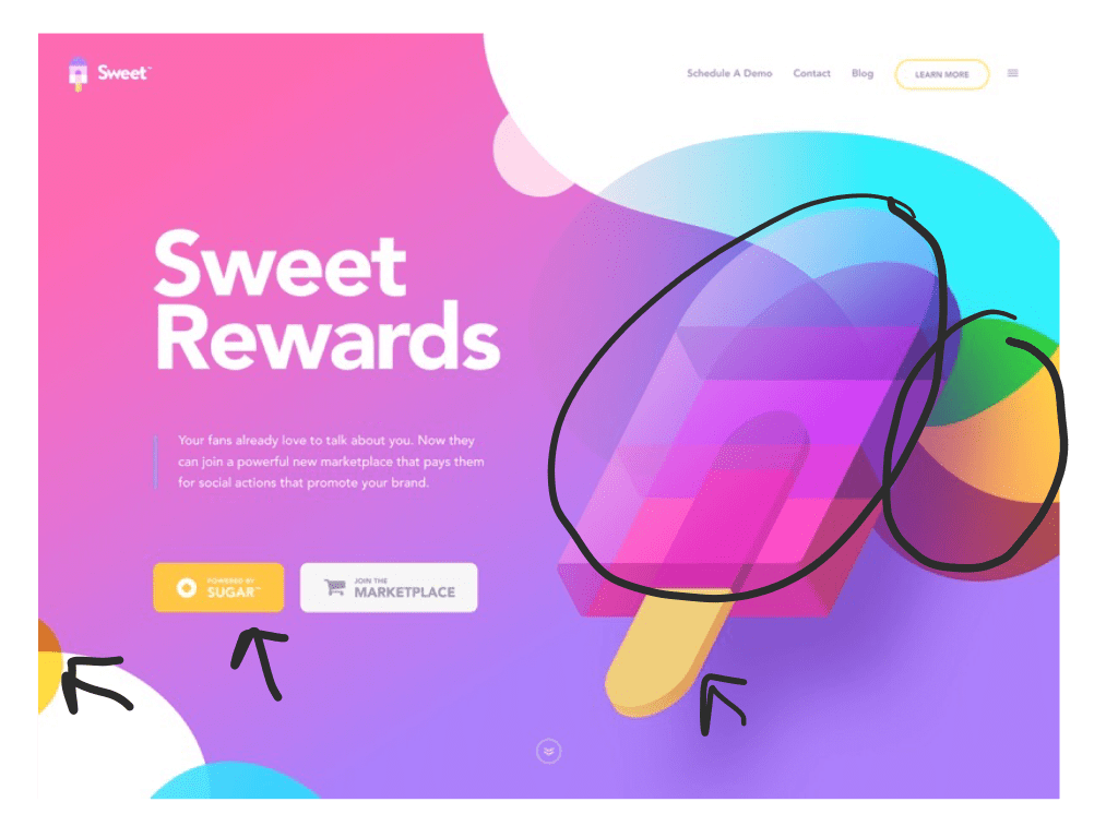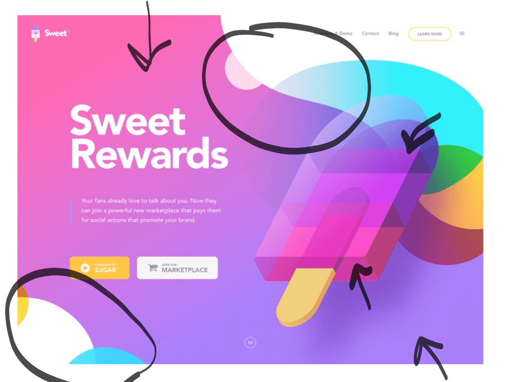 Another use of contrast that is shown here is the blocky, sharper looking shapes compared to the soft, fluid shapes. If you look at the popsicle graphic, it as a more blocky feel. However, if you look at the background and the surrounding shapes, they are more fluid such as the round bubbles and edges of the gradient background. Even the buttons have rounded corners to create that contrast.